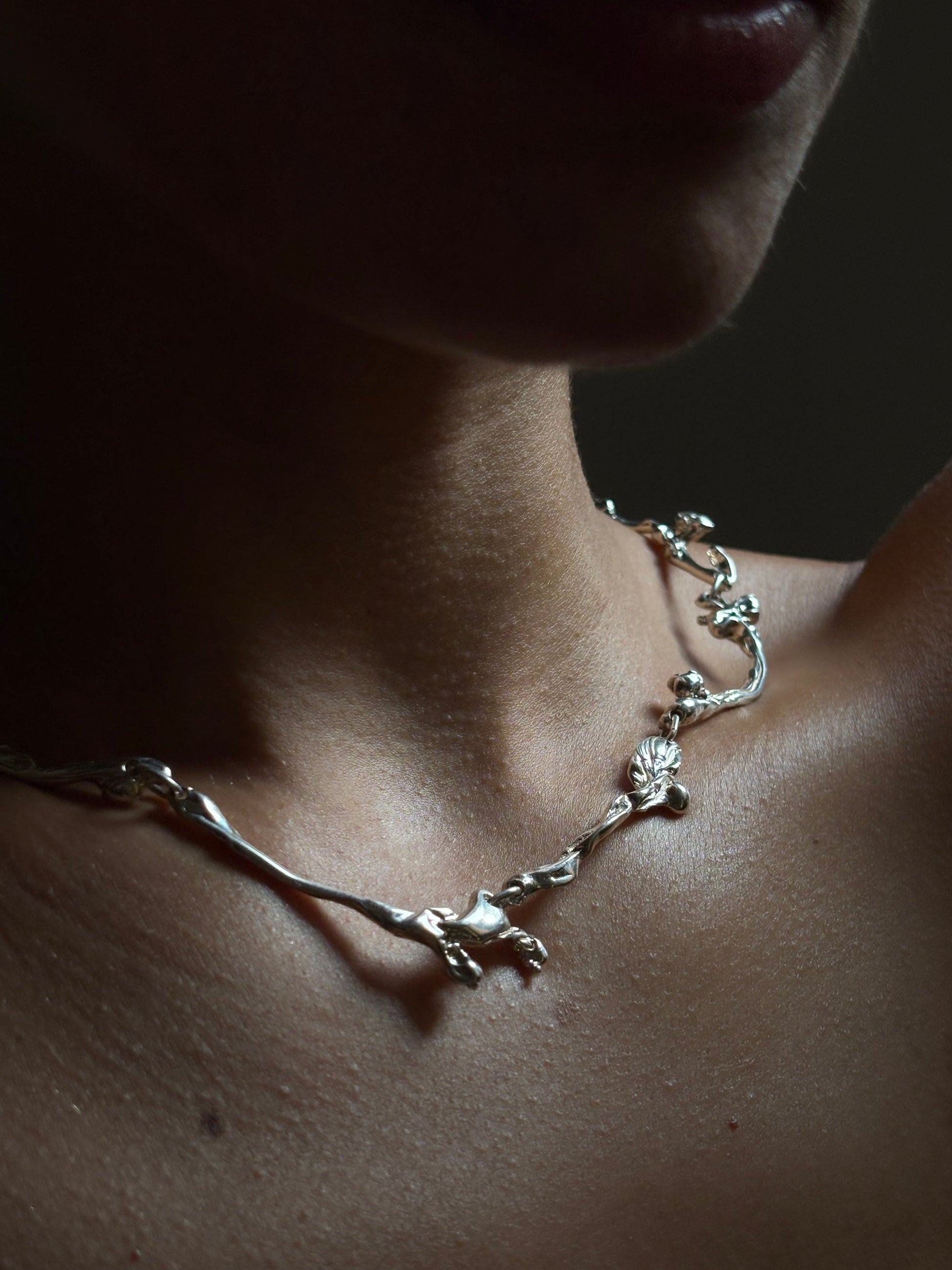 A necklace composed of leaves and branches gathered from the ground — a small act of collecting and resignifying what nature offers. Intended to be worn as a statement piece.